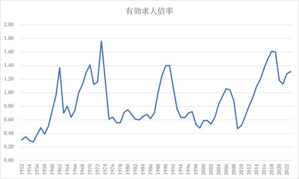 一方、1995年以降の日本はいわゆる就職氷河期の時代で有効求人倍率は1993年から2005年までの間、1倍を超えることはありませんでした。