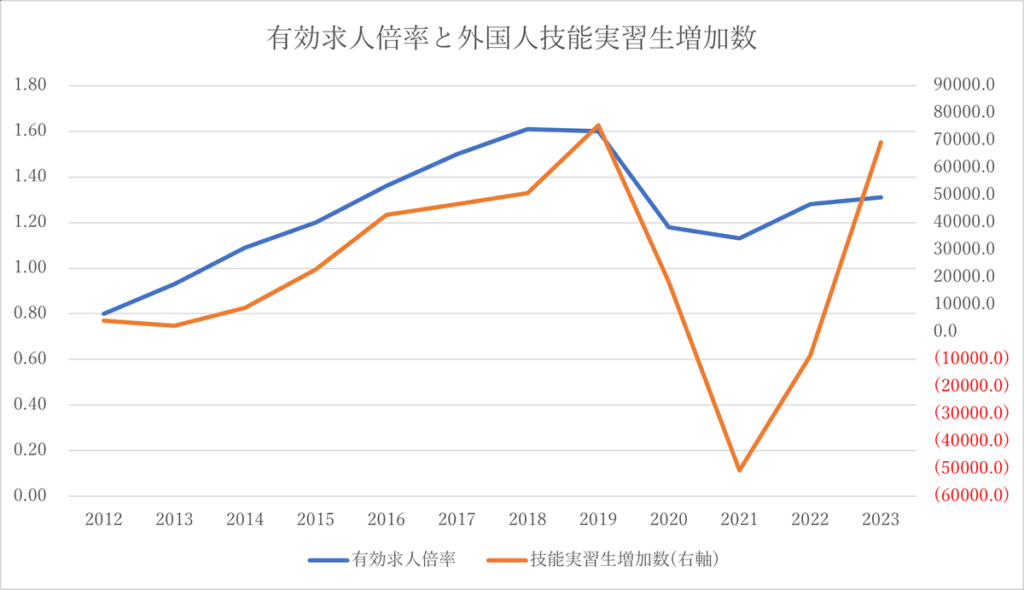 グラフからわかるように有効求人倍率の上昇とともに外国人技能実習生の受け入れ人数が増加していることがわかります。